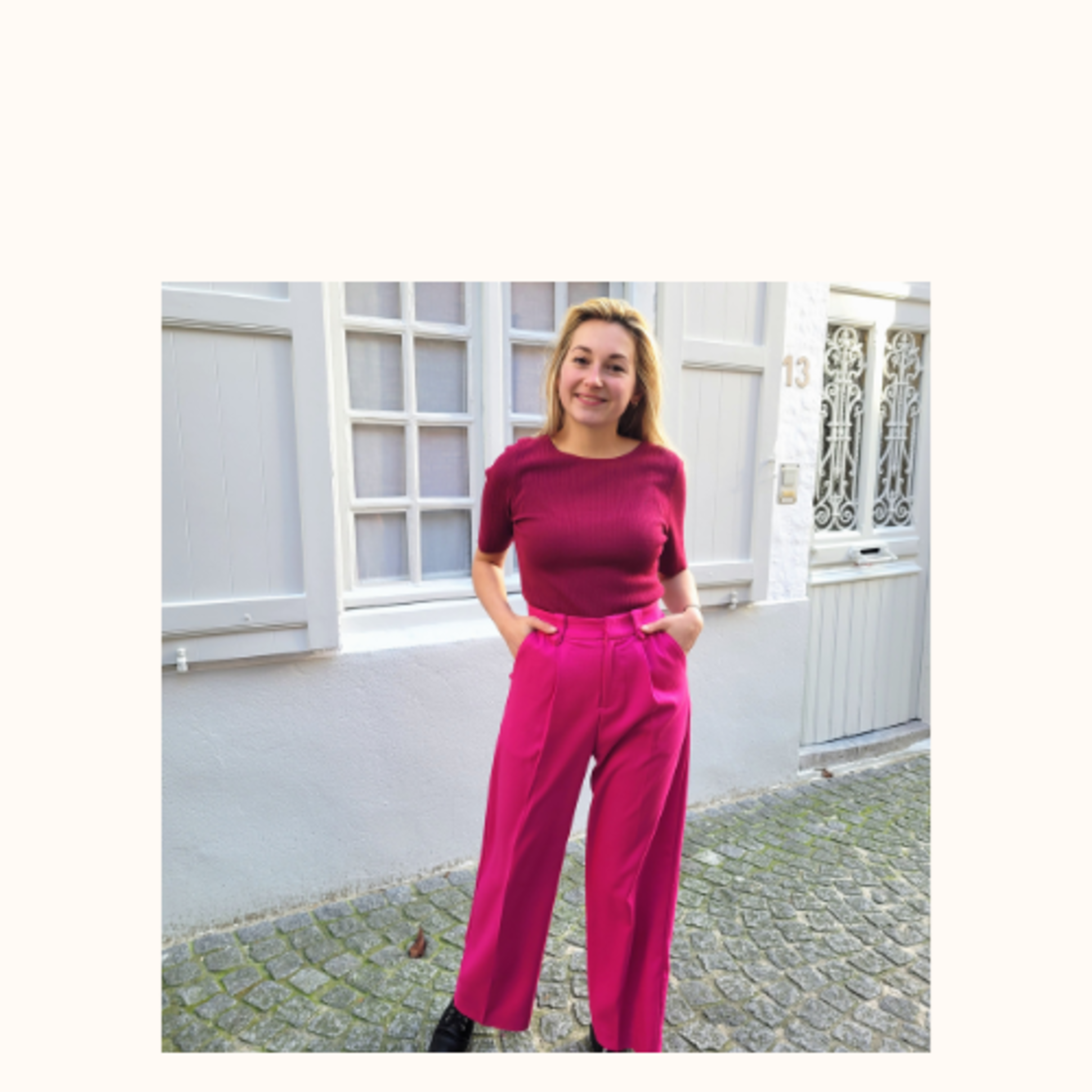 Welke kleuren zijn harmonieuze kleuren?Spreekt color blocking jou minder aan? Probeer dan eens te experimenteren met harmonieuze kleurcombo's. Hier kies je voor kledingstukken waarvan de kleuren naast elkaar op het kleurenwiel liggen. Wij testen het voor jullie uit met roze en paars. Ons roze hemd blend mooi samen met de bordeaux broek. Een kleurencombo waar je misschien niet meteen aan zou denken, maar wij zijn helemaal voor! Je kunt deze kledingstukken ook bij ons in de winkel kopen. Spreekt deze outfit jou niet aan, kom gerust eens langs bij ons in onze kledingswinkel voor dames in Brugge. Wij helpen je verder met deze techniek en zoeken samen met jou naar de perfecte outfit.